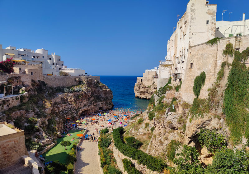 I Puglia finner vi 800 km med kystlinje, og en av de spektakulære byene langs denne kysten er lille Polignano a Mare. Her ligger gamlebyen som en balkong på de høye klippene, og utsikten fra den fantastiske promenaden mot det asurblå havet kan ta pusten fra en.